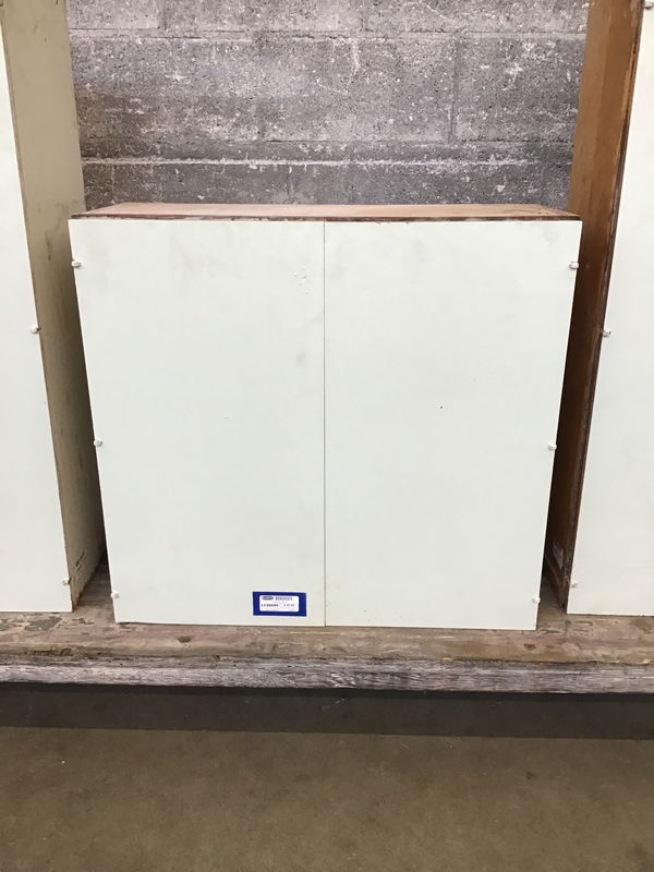 This upper shop cabinet features plywood construction, two flush face doors and an adjustable shelf. This cabinet has been painted multiple times, but would still be helpful storage in a shop.