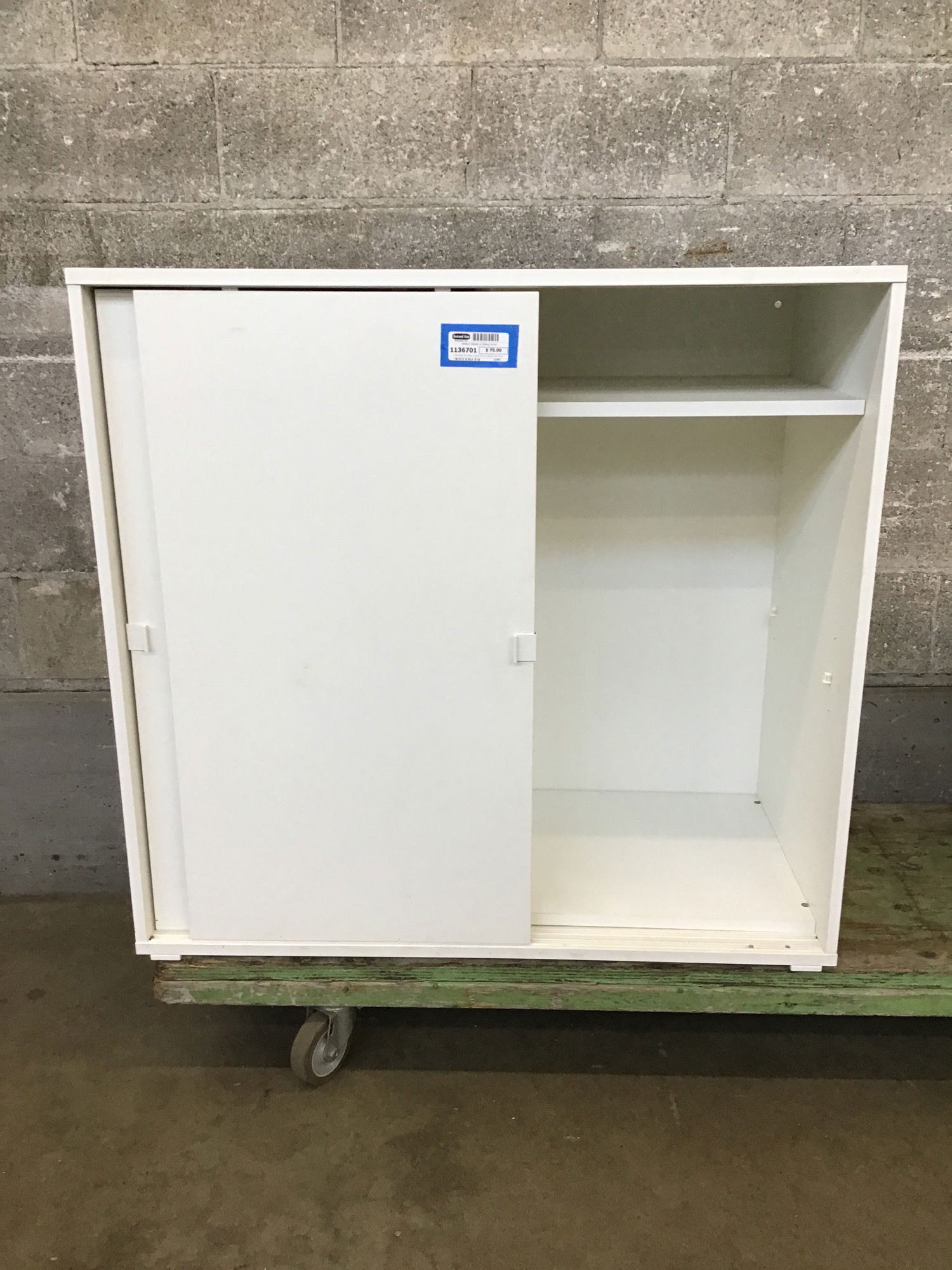 From IKEA, this VIHALS cabinet features particle board construction, two sliding doors, adjustable shelves and a white finish. Limited wear from previous use. Retails at $175+.