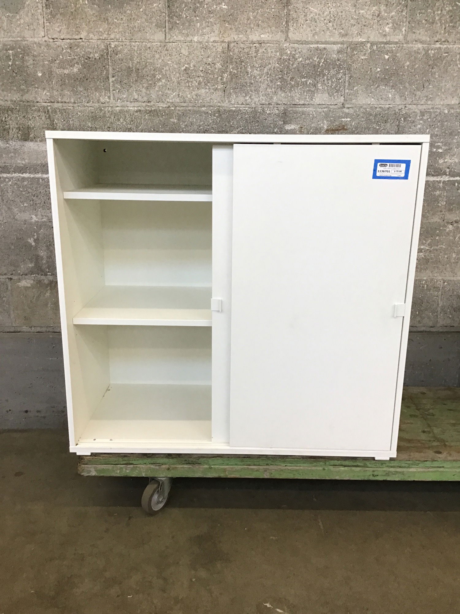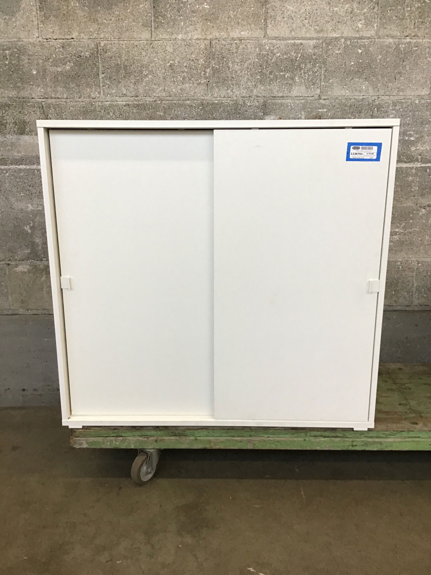 From IKEA, this VIHALS cabinet features particle board construction, two sliding doors, adjustable shelves and a white finish. Limited wear from previous use. Retails at $175+.