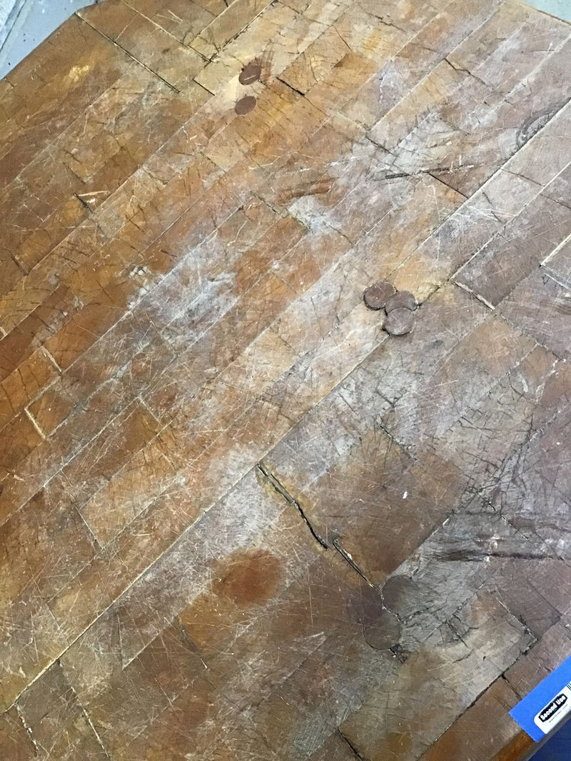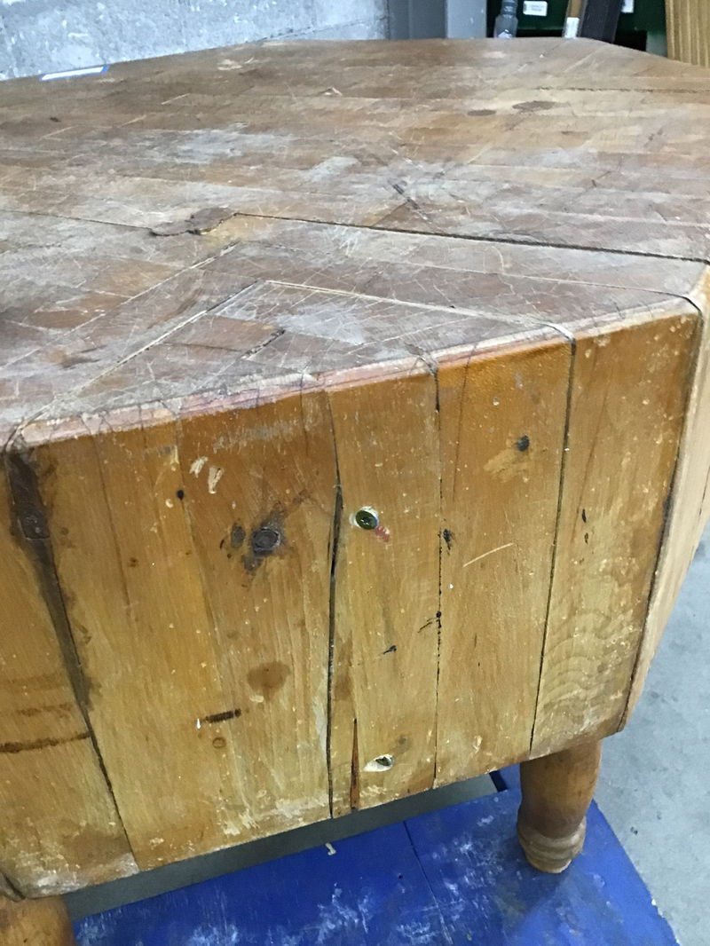 Unique & antique, 11" thick, end cut maple butcher block with an octagon shape. It's had a couple repairs over the years (note plugs/round inlays in the top and a couple more recent Torx head screws on one side) and includes some checking/splitting, but is high in authentic character. Estimated weight is 400 pounds based on ~board footage of 77 for the top (@5 Lbs. per B.F.) plus the legs. The widths across are all slightly different, but range from width and length listed.