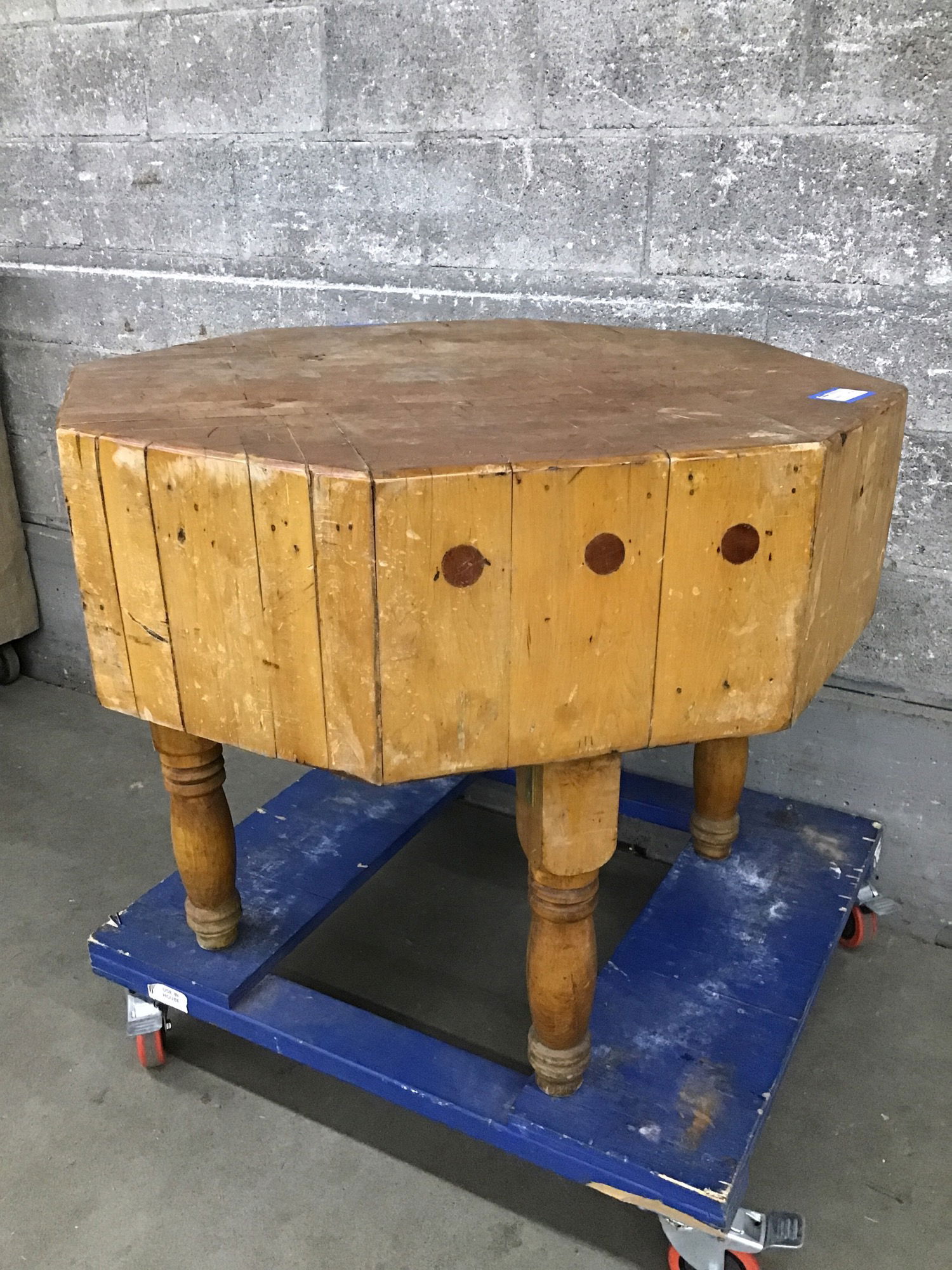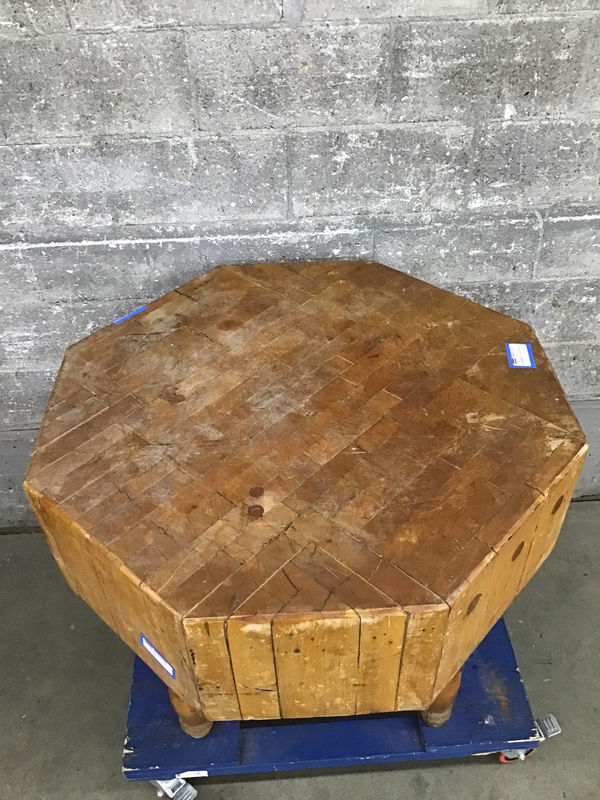 Unique & antique, 11" thick, end cut maple butcher block with an octagon shape. It's had a couple repairs over the years (note plugs/round inlays in the top and a couple more recent Torx head screws on one side) and includes some checking/splitting, but is high in authentic character. Estimated weight is 400 pounds based on ~board footage of 77 for the top (@5 Lbs. per B.F.) plus the legs. The widths across are all slightly different, but range from width and length listed.