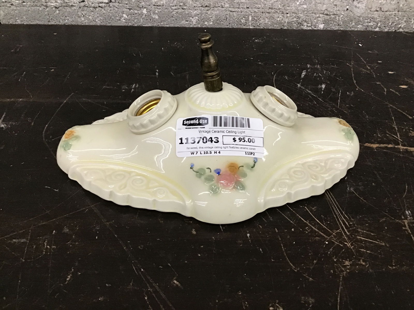 Re-wired, this vintage ceiling light features ceramic construction, pastel floral details, a glossy finish and two light sockets. Sold untested.
