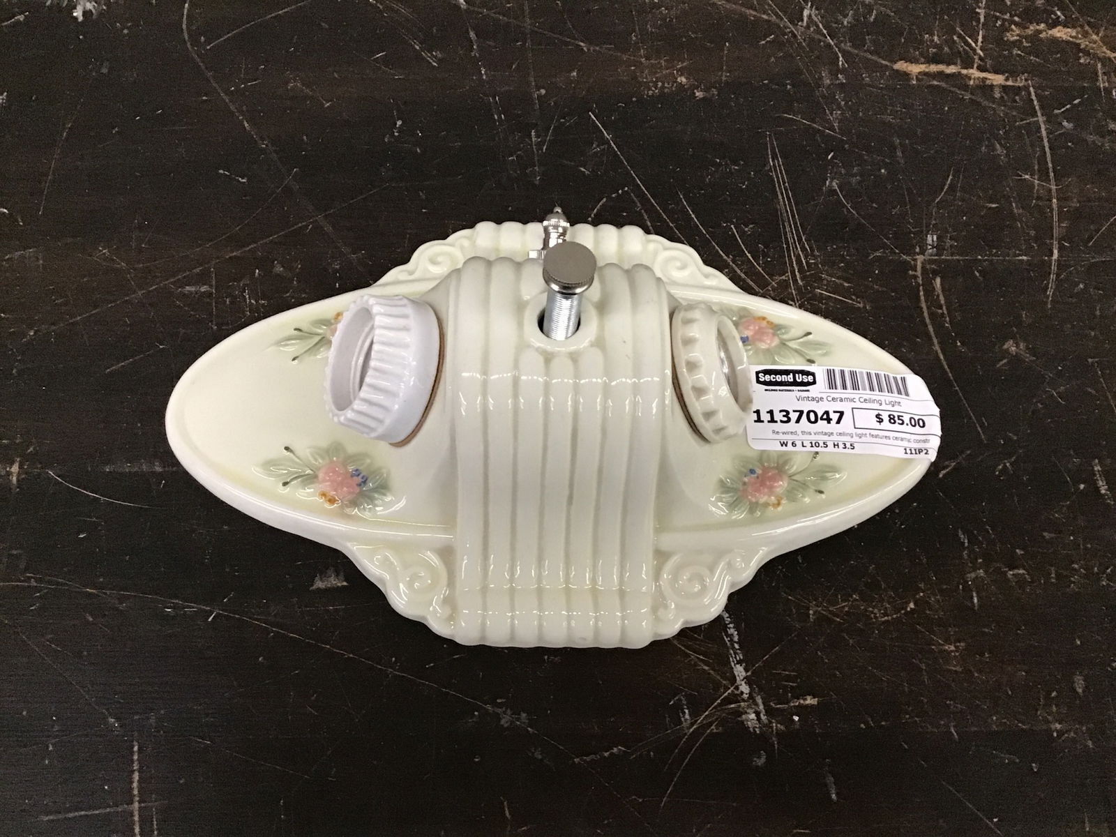 Rewired, this vintage ceiling light features ceramic construction, pastel floral details, a glossy finish and two light sockets. Sold untested. Shade missing.