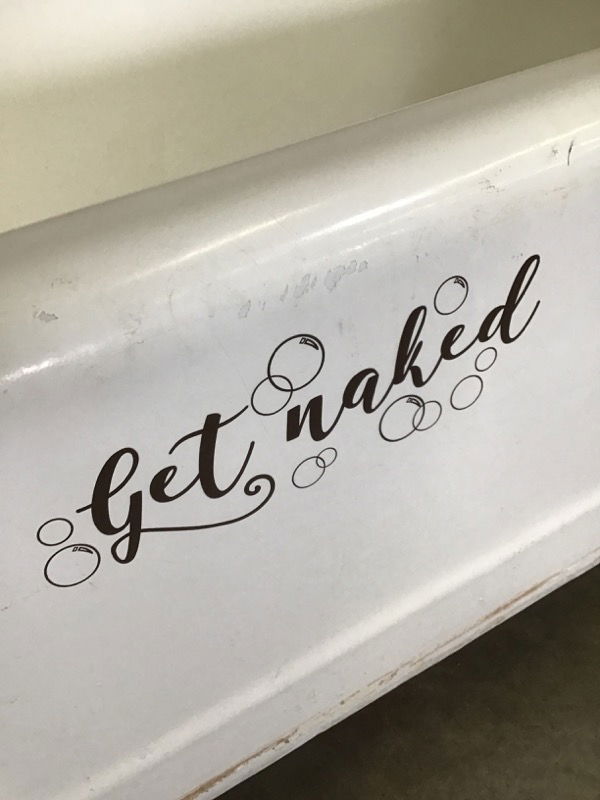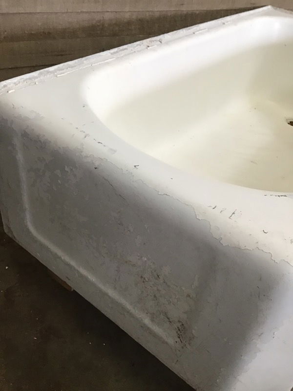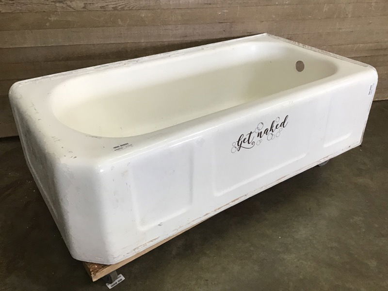 Vintage corner cast iron tub with rounded square figure. This tub was painted over at some point, and that layer is flaking off in some places. Features a stickered phrase along the side; reminding you how to prepare for the bath in a quirky way. Price reflects condition.