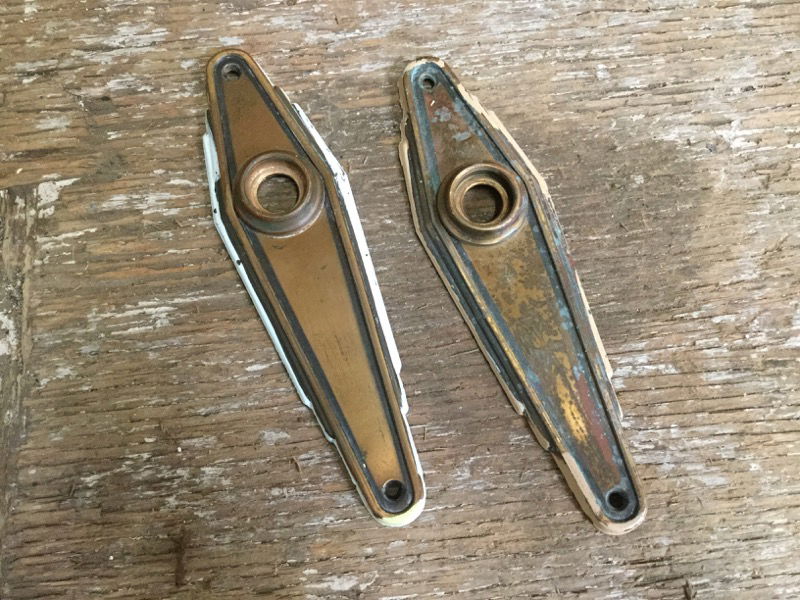 Antique copper finish Deco-era escutcheon pair. Remove the paint with a long hot sudsy soak in your crock pot. One of the plates is in worse shape than the other.