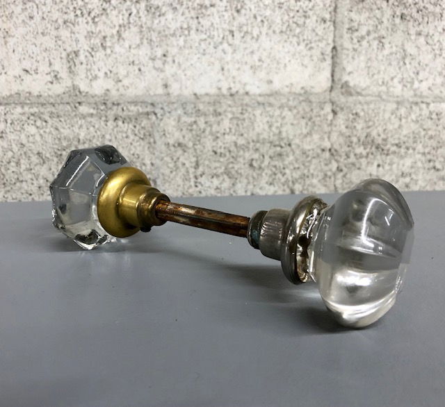 Vintage glass knob set circa 1920s - 30s with brass fitting and one nickel-plated fitting, set screws, and spindle.