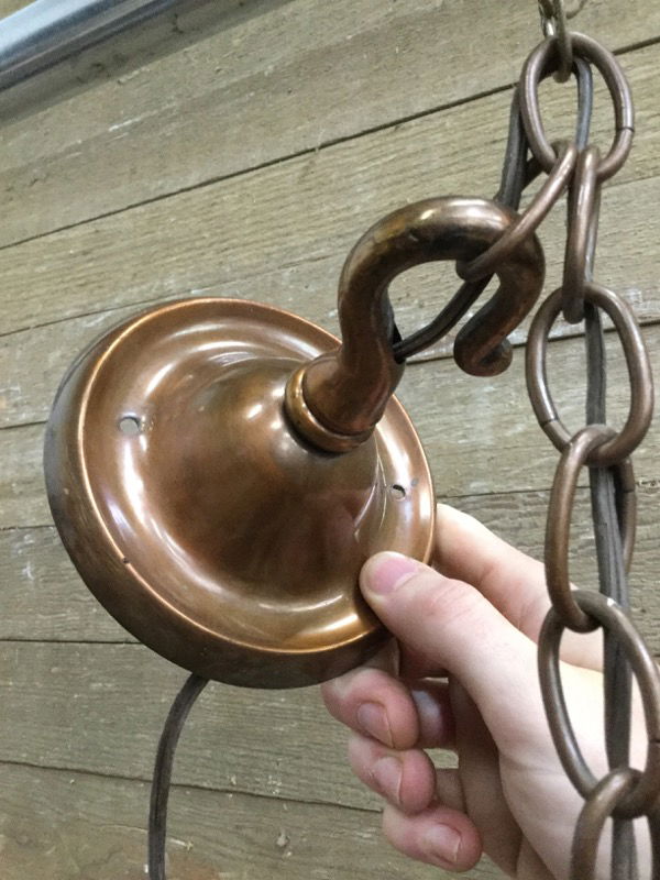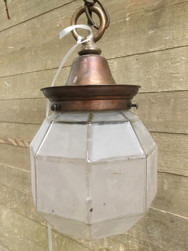 Very cool coppery hanging light, vintage, with a geometric glass globe.