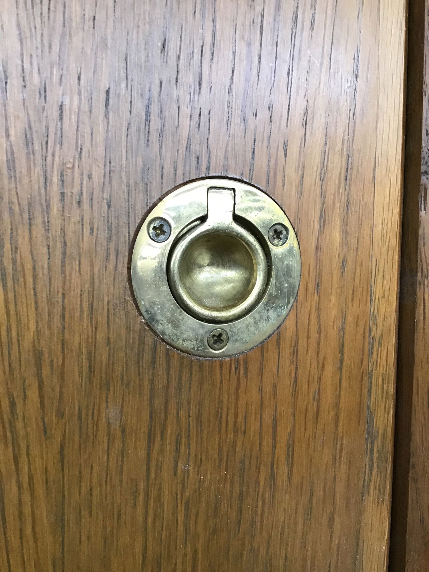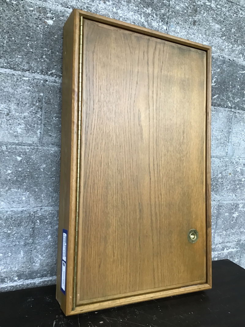 This vintage medicine cabinet features plywood construction, a stained oak face, a single door, a brass pull and a pair of adjustable shelves. Some wear from previous use.