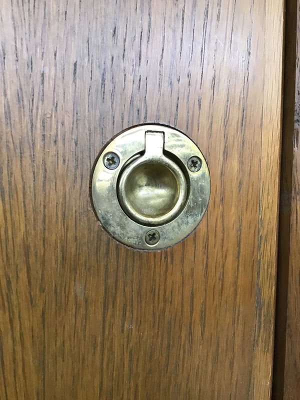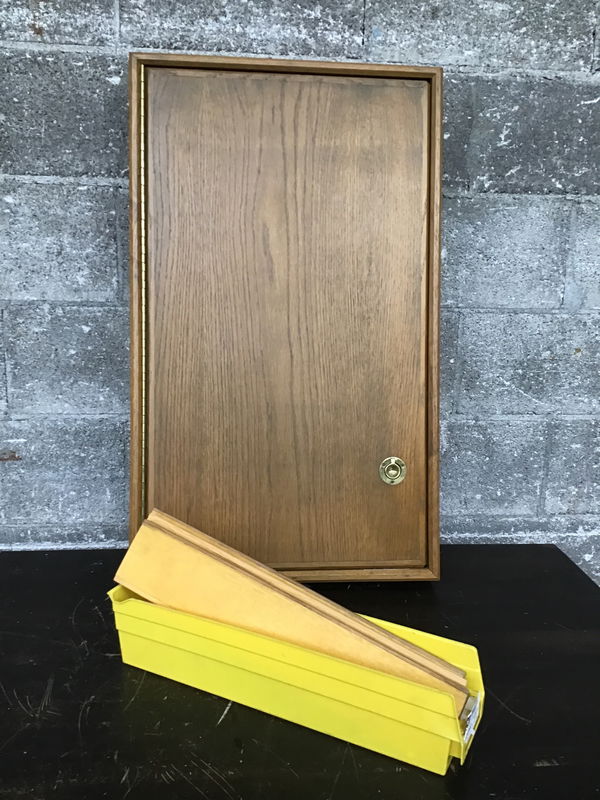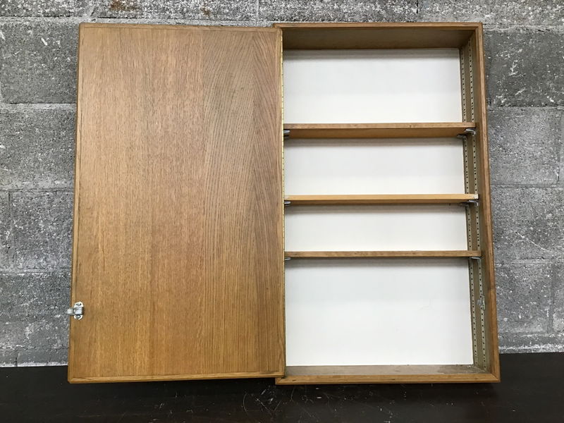 This vintage medicine cabinet features plywood construction, a stained oak face, a single door, a brass pull and a pair of adjustable shelves. Some wear from previous use.