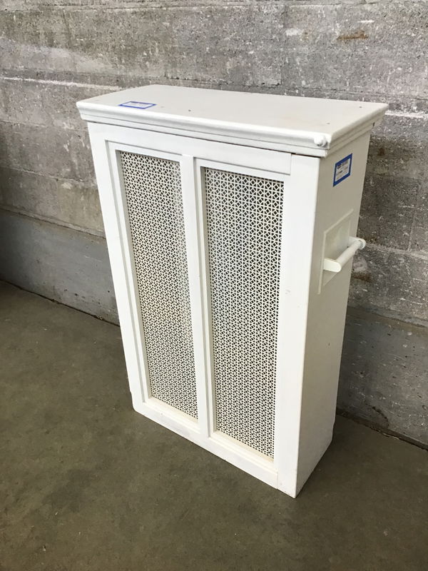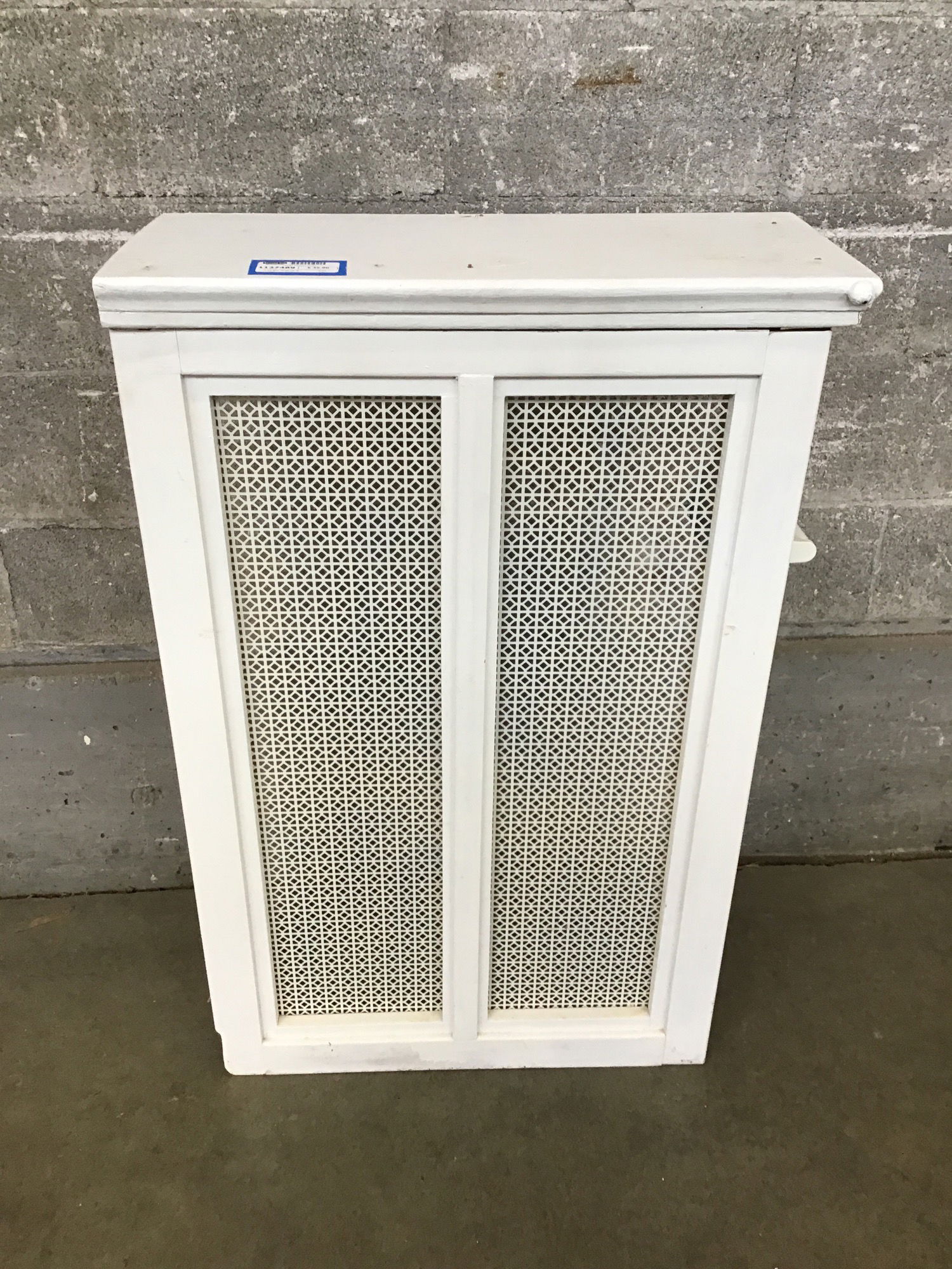 This vintage radiator cover features plywood construction, a white finish, an inset toilet paper holder and a decorative steel screen. This would be excellent for hiding your radiator or as a funky plant stand in a garden or apartment. Some wear from previous use.