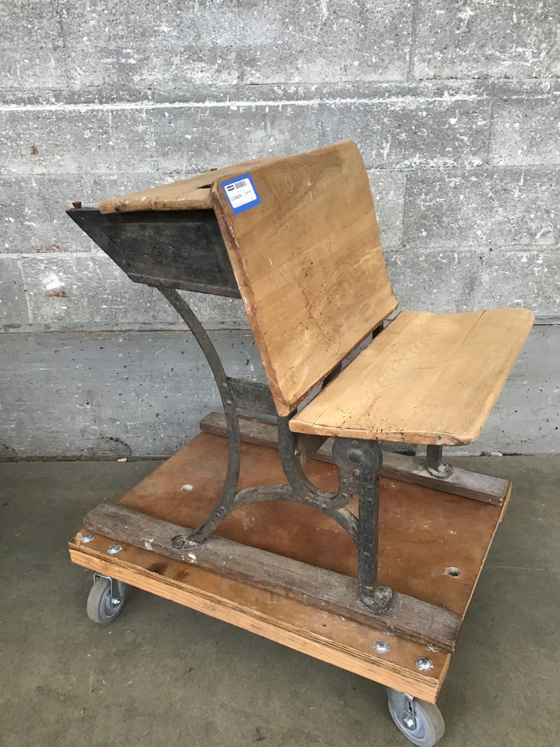 Vintage school desk that's been mounted to a couple pieces of wood. It's in decent shape for its age. Seat could probably use some oil but it still folds up. Has some scratches and wear consistent with use.