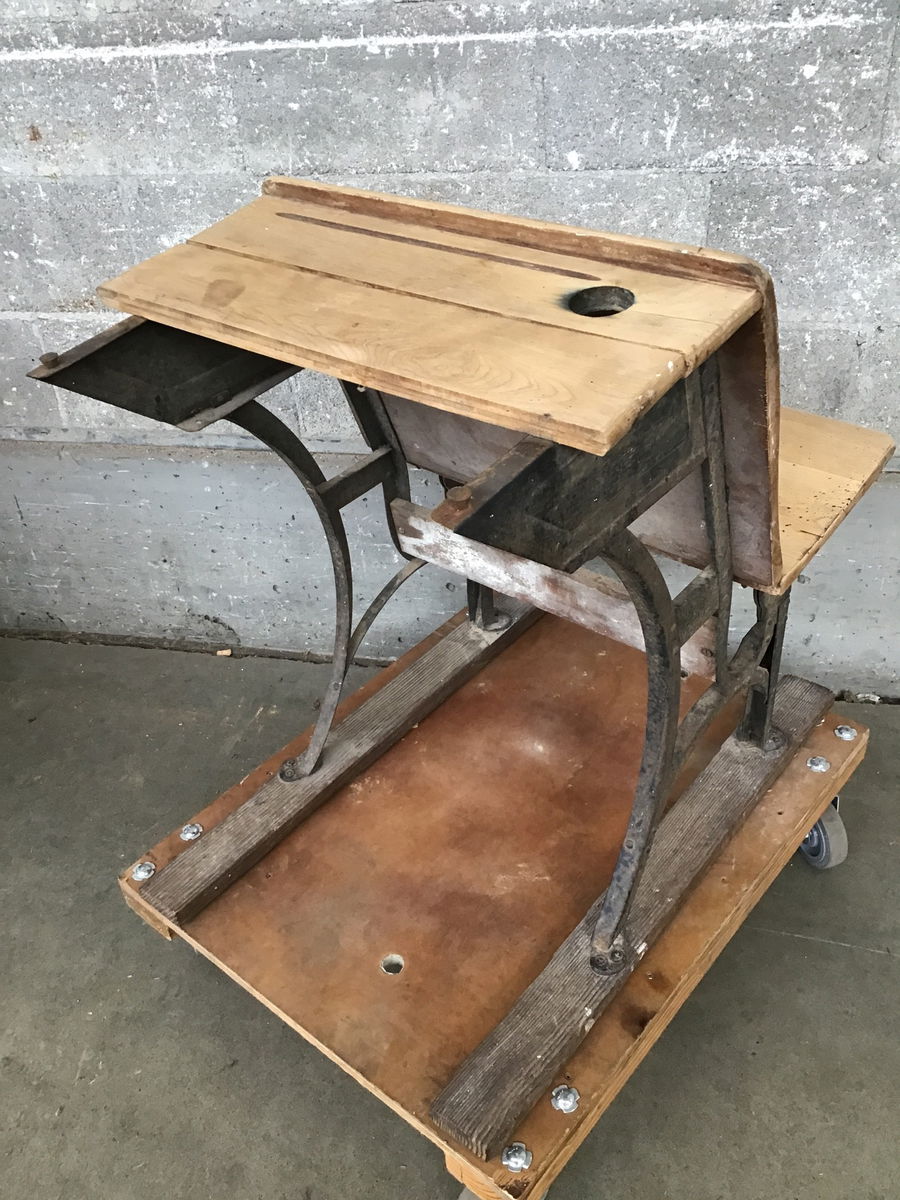 Vintage school desk that's been mounted to a couple pieces of wood. It's in decent shape for its age. Seat could probably use some oil but it still folds up. Has some scratches and wear consistent with use.