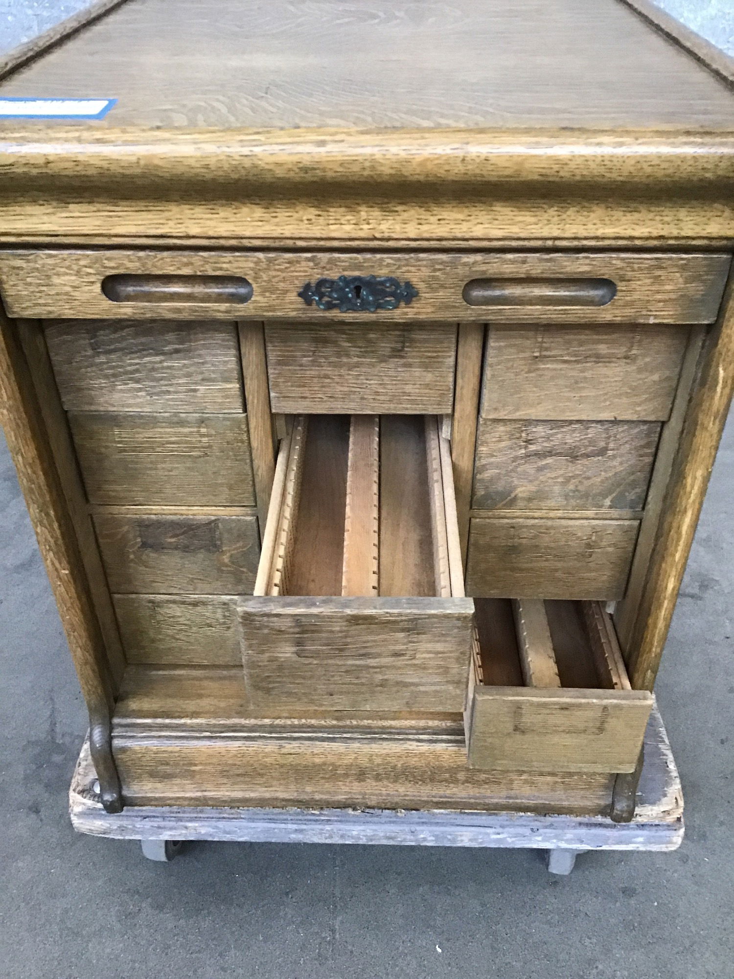 Absolutely stunning Tiger Oak slide file cabinet that features 10 drawers and a tambour style door that rolls up smooth as butta and looks gorgeous. It's in amazing shape minus some age appropriate cosmetic wear and tear and missing drawer handles. Snag it for a steal and store your bits and bobs in style!