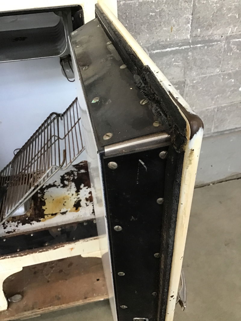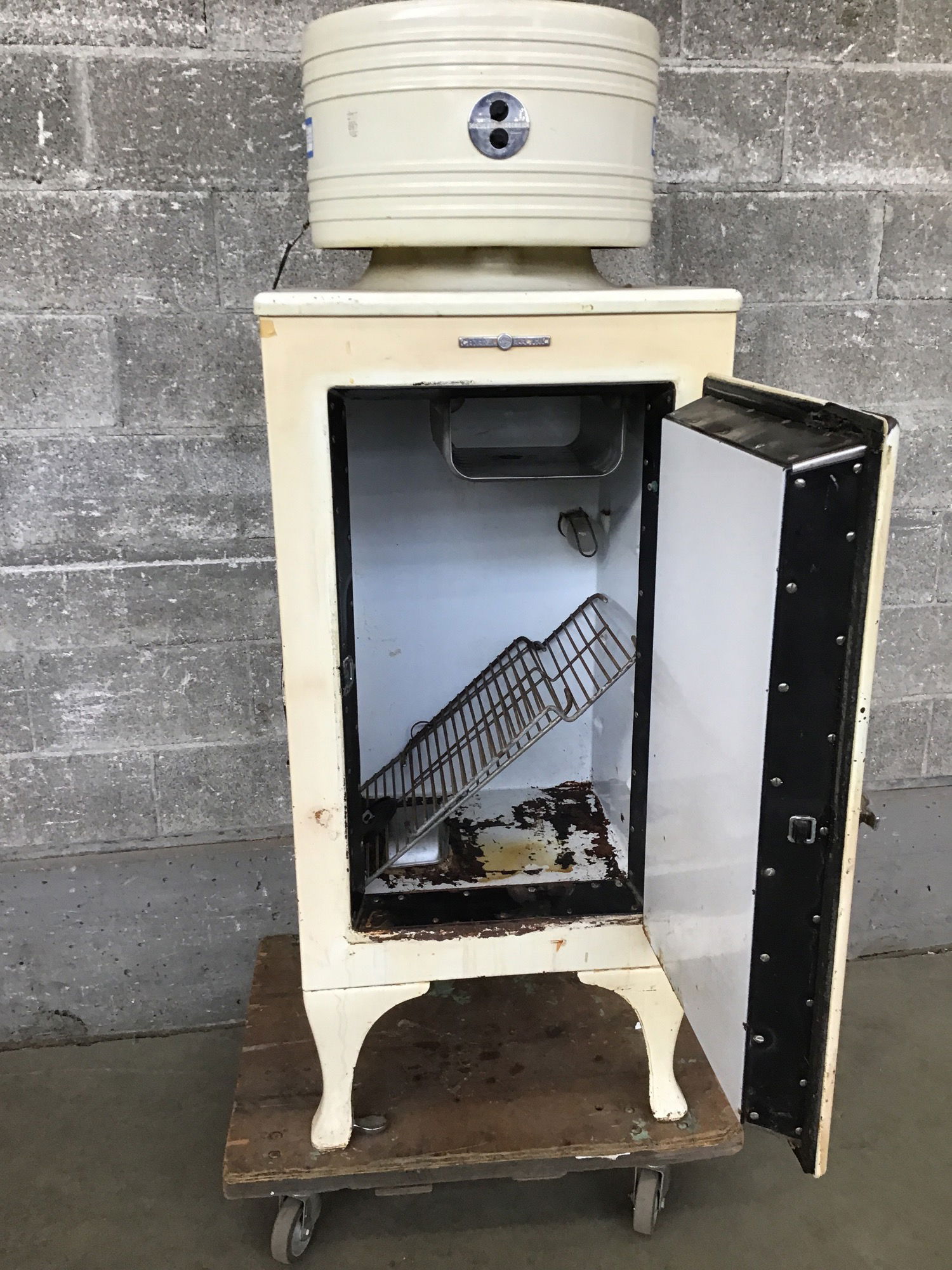 Vintage, bordering on antique, monitor top fridge refrigerator made by General Electric back when there was no such thing as "planned obsolescence" since this beast is still working fine from what I could tell. There's a small "freezer compartment" just below the compressor. The cord needs to be replaced, but I wired a cord directly the the compressor unit on top, and it seems to work just fine. Cooled down to 30 degrees where it had been set at 8. I dialed it back to 4, and the compressor shut off. The unit does show wear from use (scratches, discoloration and some small chips to the finish), and the door gasket needs to be replaced, but it's a fairly good piece if you're looking for a restoration project and usable as is.