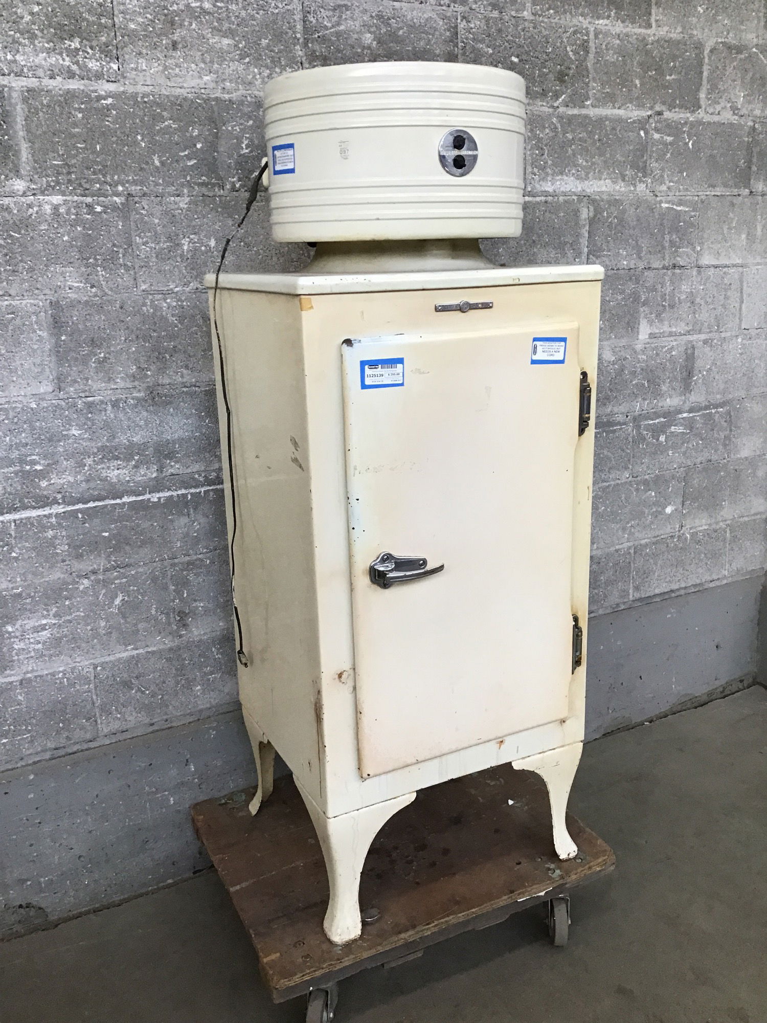 Vintage, bordering on antique, monitor top fridge refrigerator made by General Electric back when there was no such thing as "planned obsolescence" since this beast is still working fine from what I could tell. There's a small "freezer compartment" just below the compressor. The cord needs to be replaced, but I wired a cord directly the the compressor unit on top, and it seems to work just fine. Cooled down to 30 degrees where it had been set at 8. I dialed it back to 4, and the compressor shut off. The unit does show wear from use (scratches, discoloration and some small chips to the finish), and the door gasket needs to be replaced, but it's a fairly good piece if you're looking for a restoration project and usable as is.